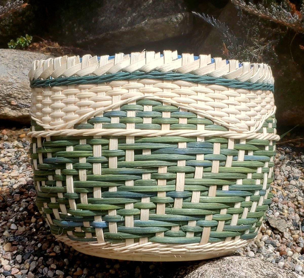 This basket will feature weaving on a wooden slotted base, 4-rod wale, continuous twill weave and a sawtooth border. It really looks and sounds harder than it is, and lends a challenge to anyone who is ready to go beyond the beginner stage... hence the "Intermediate" weaver. The kit for this class will include all materials to complete the project. There will be at least 2 color choices, with colors depending on the availability of dyed reed. Size of the completed basket is 10" diameter X 8-1/2" H